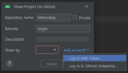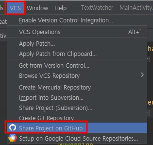 1. 안드로이드 스튜디오의 최상단 메뉴의 VCS - Share Project on GitHub 선택