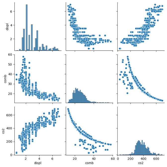 sb.pairplot(data= df, vars= ['displ', 'comb', 'co2'])